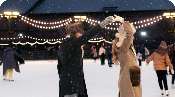 Большой каток и прокат коньков на территории парковой зоны аутлета, где каждый желающий сможет попробовать свои силы на льду.